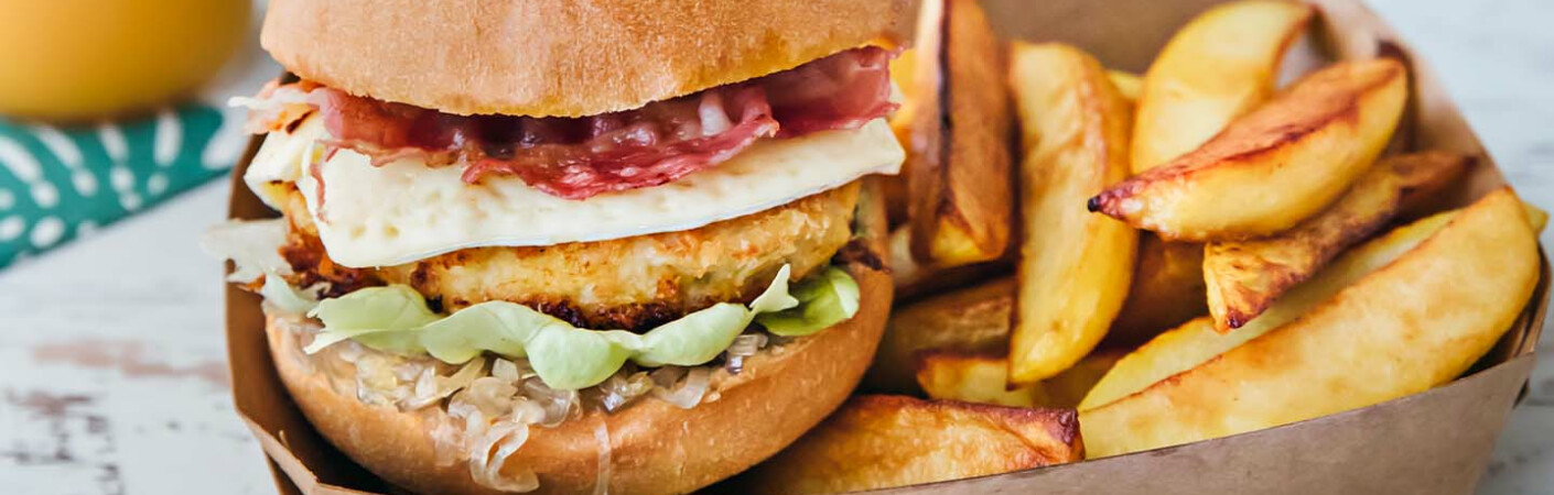 - Déposer sur la partie inférieure du pain le confit d’échalotes, ajouter la salade, le poulet pané, deux tranches de brie La Vie de Château, et le lard. Refermer avec la partie supérieure du pain.