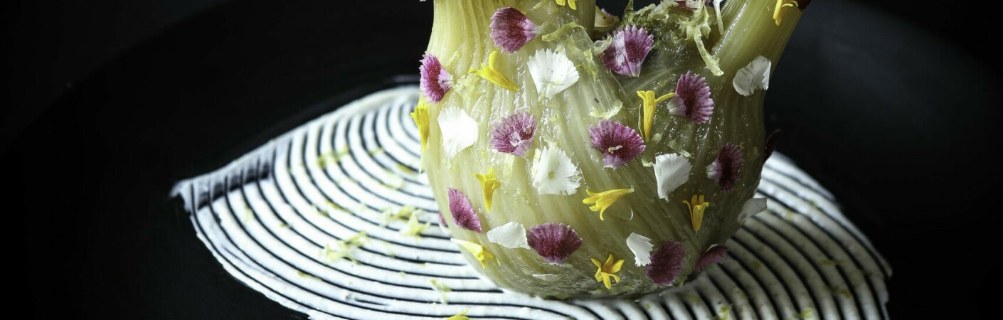 Dresser avec la sauce au fond et les fenouils cuits, tailler des copeaux de fenouil crus à citronner pour la texture.