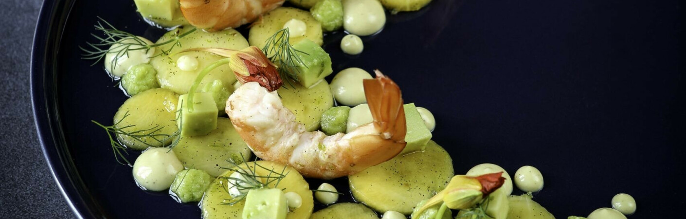 L’avocat crevette réinterprété mayonnaise au fromage blanc et mangue marinée