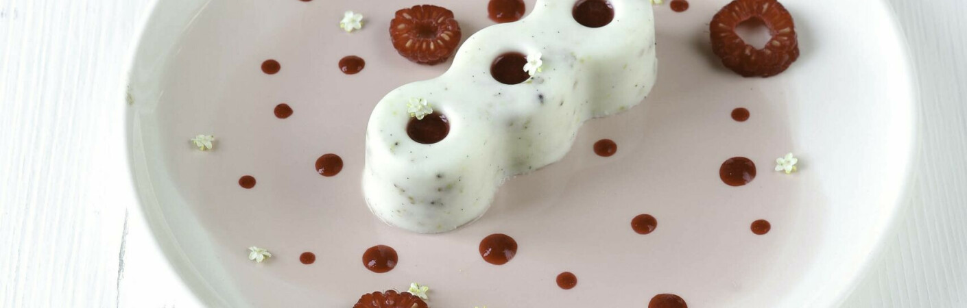 Panna cotta fromage blanc à la fleur de sureau citron et framboise