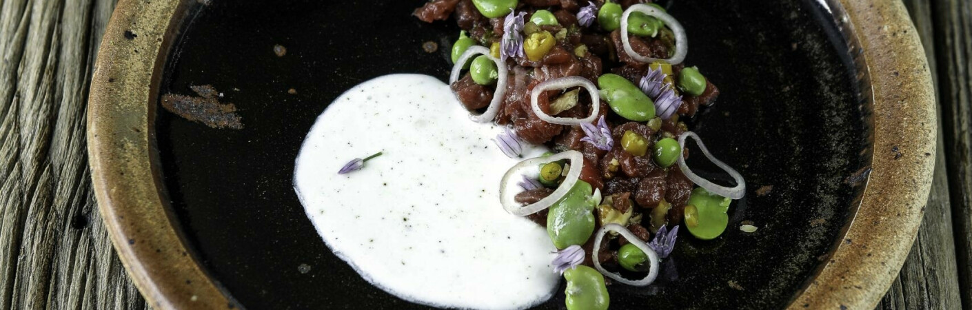 Tartare de boeuf sauce fromage blanc au rodez condiment fèves petits pois et piments doux